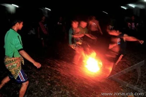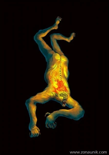Hantu yg berjalan dengan kedua tangan dan tubuhnya terbalik disertai api.